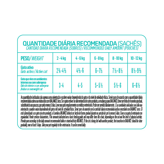 Sabroso y nutritivo, Balance Sachet es el alimento completo y balanceado perfecto para tu gato. Con ingredientes de calidad e inclusión de vegetales, nuestro alimento húmedo fue desarrollado por médicos veterinarios para ofrecer el producto ideal a los felinos, todo esto sin aromas ni colorantes artificiales.